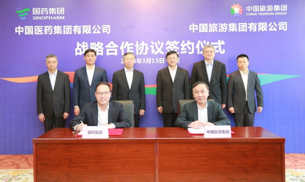 3月15日,集團與國藥集團在深圳簽署戰略合作協議,雙方旗下中國旅游集團中免股份有限公司與中國國際醫藥衛生有限公司簽署股權合作協議。集團董事長陳寅,總經理王海民;國藥集團董事長劉敬楨,副總經理胡建偉、董增賀、晉斌出席簽約儀式并見證簽約。集團副總經理、中國中免董事長李剛與國藥集團副總經理鄧金棟分別代表雙方簽署戰略合作協議,中國中免總經理王軒與國藥國際總經理周頌分別代表雙方簽署股權合作協議。