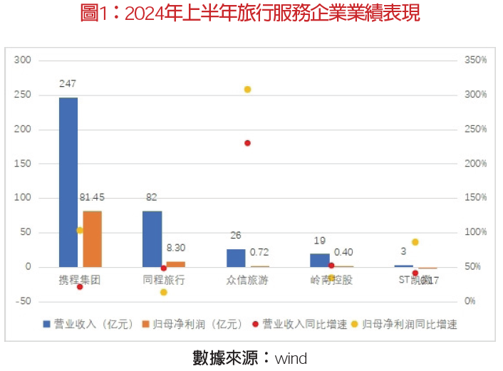 市場向在線旅游企業集中,OTA企業規模效應進一步加大。今年上半年,攜程、同程兩大OTA企業營收占本報告跟蹤的29家旅企營收的27.15%,其中, 攜程集團實現營業收入247億元,同比增長21%,較2019年增長46%;歸母凈利潤81億元,同比增長103%,較2019年增長93%。同程旅行實現營業收入82億元,同比增長48%,較2019年增長140%;歸母凈利潤為8.3億元,同比增長13%,較2019年增長180%。國際化業務是支撐OTA企業業績增長的重要因素之一。二季度經營數據顯示,攜程集團國際OTA 平臺的總收入同比增長約70%;出境酒店和機票預訂已全面恢復至2019年疫情前同期的100%水平,顯著超越行業平均70%以上的國際航班恢復率。同程旅行國際機票預訂量創下歷史新高,同比增長160%, 國際酒店間夜數同比增長140%。平臺用戶量穩步提升,市場下沉。同程旅行截至2024年6月30日止,12 個月實現年付費用戶數2.28億,同比增長4.8%,其中居住在中國非一線城市注冊用戶數占87%以上。