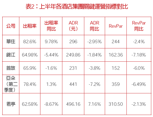 受上半年宏觀消費以及去年高基數影響,上半年各大酒店集團出租率表現分化,RevPAR、ADR則普遍出現下滑。上半年,受宏觀經濟不確定以及消費者信心不足等因素影響,商旅需求方面,差旅預算收緊,商務差旅活動更多集中在中心城市。旅游需求方面,消費信心下滑,酒店行業面臨消費分級的壓力,此外,二季度開始極端天氣明顯,出行減少。從出租率來看,華住和亞朵酒店保持了正增長,分別同比增長9.78個百分點和1.3個百分點;錦江同比下降5.44個百分點,首旅則微降1.6個百分點,君亭酒店下降8.67個百分點。從平均房價和間房收益來看,亞朵和君亭酒店作為中高端酒店的代表,其平均房價和間房收益明顯高于華住、錦江和首旅酒店,但從同比來看,受整體宏觀環境及惡劣天氣影響,亞朵和君亭酒店的同比降幅也較大,其中君亭酒店旗下新安江景瀾酒店遭受的持續大雨和洪澇災害致使酒店停業抗災長達半月之久。華住集團預計今年7、8兩月暑期數據將同比下降10%左右。