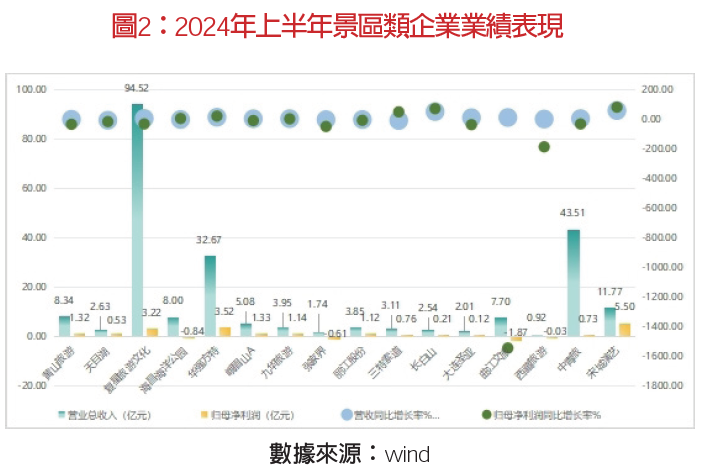 從營業收入來看,復星旅文[復星旅游文化度假資產管理中心即地產銷售、運營收入為2.9億元人民幣,占總營收的3%]銷售能力最強,2024上半年營收94.52億元,華強方特和宋城演藝分別營收32.67億和11.77億元。從盈利能力來看,宋城演藝盈利能力最強,歸屬母公司股東凈利潤5.5億元,華強方特和復星旅文歸母凈利潤分別為3.51億元和3.22億元。海昌海洋公園、張家界、曲江文旅、西藏文旅仍處于虧損狀態。從同比增速來看,宋城演藝、長白山營收和歸母凈利潤較2023年同期增長率均超過50%。整體來看, 旅游市場回歸理性,景區類上市公司多數盈利能力較為一般,歸母凈利潤區間值為虧損千萬和盈利3億元之間,大多企業盈利同比2023年出現下降,整體形勢不樂觀。