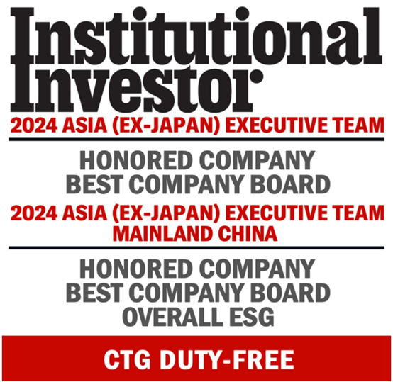 《Institutional Investor》是全球最具影響力的金融媒體之一,憑借高質量評選標準聞名業界,其評選結果完全由金融界專業人士投票產生,排名結果為業內公認的全球投資風向標。上述獎項的獲得,再次體現了全球資本市場對中旅免稅經營發展、董事會履職、ESG踐行等方面工作成效的高度認可。