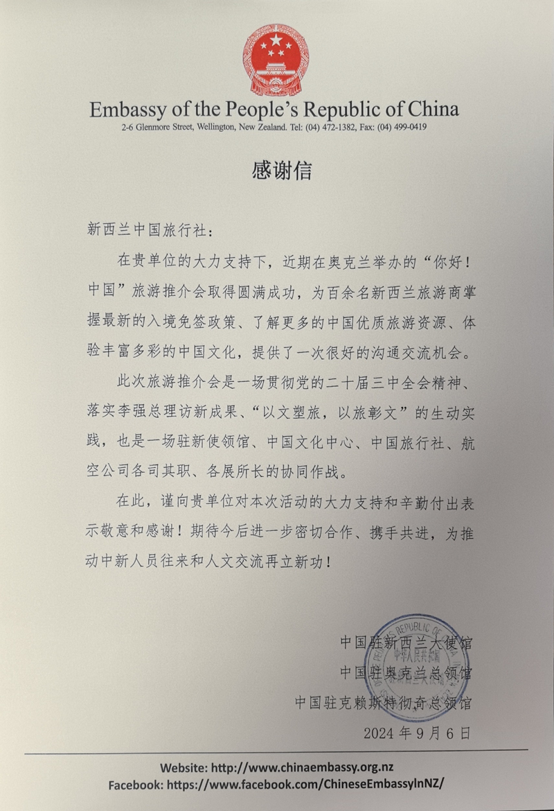 近日,中旅旅行所屬新西蘭中旅收到中國駐新西蘭大使館、中國駐奧克蘭總領館、中國駐克萊斯特長期總領館聯名感謝信。中國駐新西蘭大使館等單位對新西蘭中旅在奧克蘭舉辦的“你好!中國”旅游推介會中提供的支持表示感謝,并期待今后與新西蘭中旅進一步密切合作,為推動中新人文交流和人員往來再立新功。
