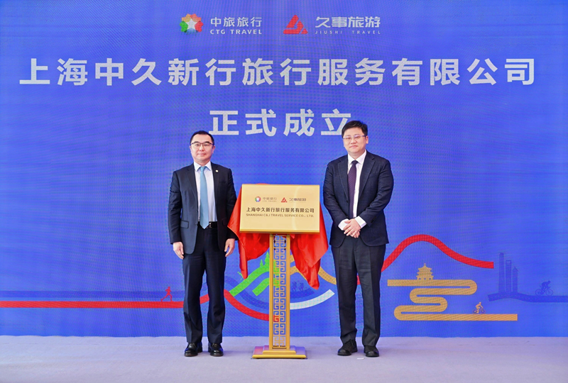 4月25日,中旅旅行與久事旅游合資組建的上海中久新行旅行服務有限公司(以下簡稱“中久新行”)在黃浦江畔的世界會客廳舉行揭牌儀式。集團黨委委員、副總經理簡易與久事集團黨委副書記葉章毅共同為新公司揭牌,上海市文化和旅游局、中旅旅行、久事旅游相關負責人及合作伙伴、旅行商代表共同出席了此次活動。