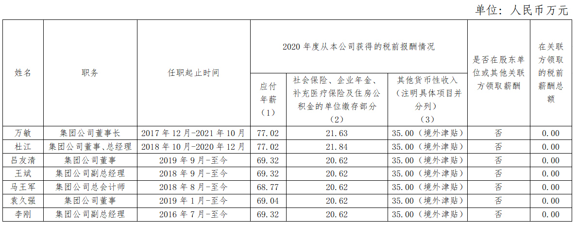 中國旅游集團有限公司企業負責人2020年度薪酬情況