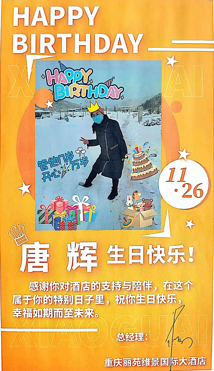 象往常一樣,我還在為采購的事情忙的焦頭爛額,突然手機傳來微信的提示音,還以為又有什么工作要做,打開微信界面的一剎那,我瞬間淚目。我的娘家——重慶麗苑維景國際大酒店,并沒有忘記遠在崇禮支援冬奧的我,專門為我錄制了一段生日祝福視頻,制作了一張生日海報,酒店總經理肖梅總還親筆為我送上祝福。大家的祝福與鼓勵讓我心里暖暖的,有“娘家人”為我撐腰,我定然“雄起”!