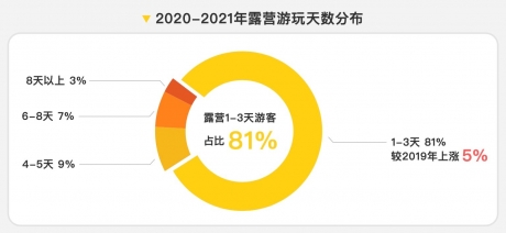 放松休閑的屬性決定了以周末出行為主的“微度假”是露營最主要的場景。數據顯示,81%的游客選擇用1-3天來體驗露營,親近自然、恢復元氣。露營地的選擇也不僅局限于所在城市,很多消費者喜歡到周邊城市體驗更新鮮的環境。比如,廣州和深圳的消費者,會選擇自駕1-2小時即達的惠州、佛山、中山露營。