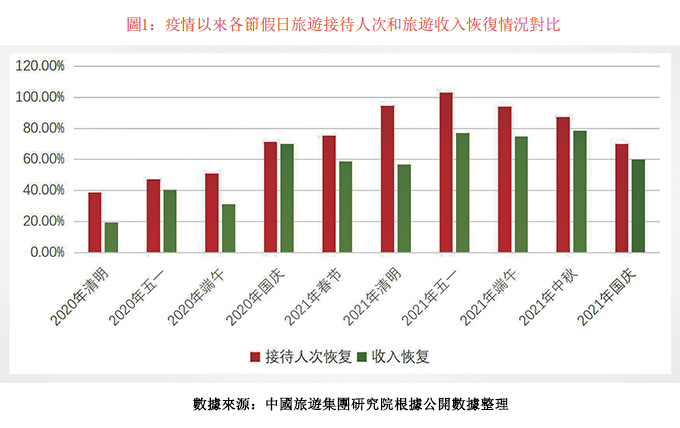 國內(nèi)旅游呈現(xiàn)先高后低、跌宕起伏的復蘇特征。受益于疫情的有效控制,國內(nèi)旅游在全球率先復蘇,但2021年下半年以來,受疫情多點散發(fā)、跨省游熔斷「常態(tài)化」等影響,復蘇速度有所減慢。根據(jù)中國旅游研究院最新預測數(shù)據(jù),2021年國內(nèi)旅游接待人數(shù)恢復到2019 年的57%,國內(nèi)旅游收入恢復到2019年的53%,顯著低于其對2021年上半年的預測數(shù)據(jù)。中國旅游研究院此前預測數(shù)據(jù)顯示,2021上半年國內(nèi)旅游接待人次恢復到疫情前的7成左右。節(jié)假日出行市場先行復蘇。2021年春節(jié)、清明、五一、十一等節(jié)假日國內(nèi)旅游人數(shù)分別恢復到疫情前同期的75.3%、94.5%、103.2%和70.1%,國內(nèi)旅游收入恢復到疫情前同期的58.6%、56.7%、77.0%和59.9%,好于年度恢復情況。主要客源地恢復優(yōu)于主要目的地。靠近主要客源市場的旅游景區(qū)客流增長趨勢明顯,而面向中遠程旅游市場的自然資源和歷史文化資源型旅游景區(qū)接待人次和綜合旅游收入下降明顯。中國旅游研究院專項調(diào)查數(shù)據(jù)顯示,游客目的地平均游憩半徑從2020年的14.2公里收縮到2021年的13.1公里。