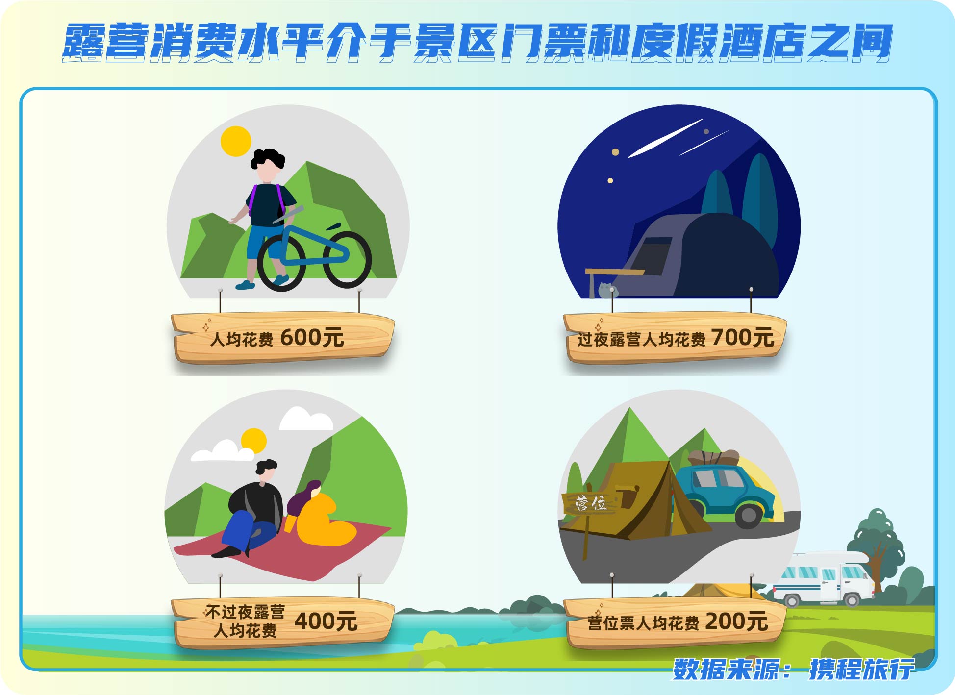 體現在具體消費力層面,攜程數據顯示,露營旅游的花費介于景區門票和周邊酒店預訂的費用之間。截至目前,通過攜程購買露營產品的人均消費約600元左右。其中,過夜露營產品人均花費約700元,不過夜的產品人均花費在400元上下,單純的營位票人均花費在200元上下。從產品類型來看,在省心省力、拎包入住的精致露營產品類別中,選擇過夜露營的游客占比高達八成。