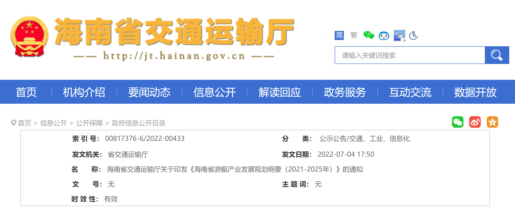 7月4日,海南省交通運輸廳于印發《海南省游艇產業發展規劃綱要(2021-2025)》。