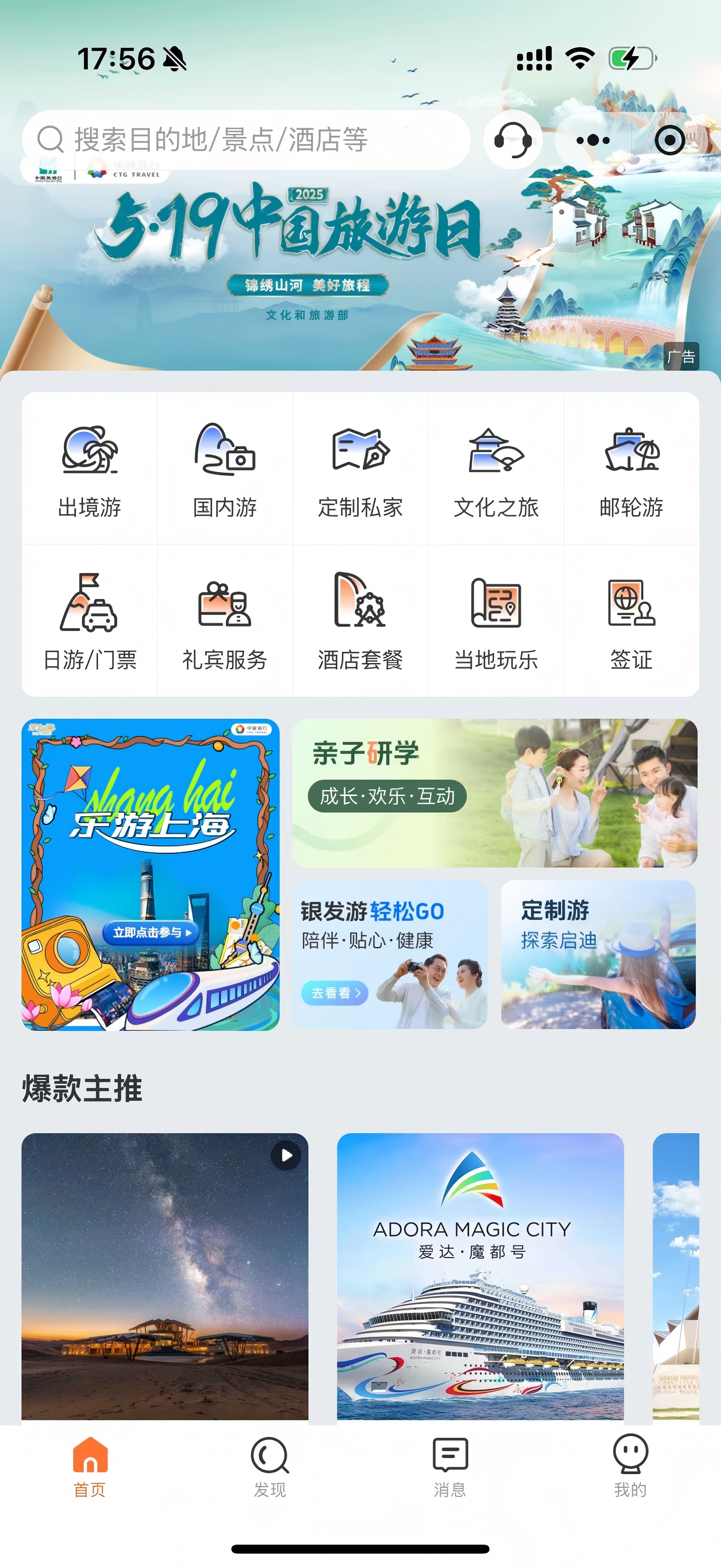 “中旅旅行”線上銷售平臺包括PC網(www.ourtour.com)、App和小程序,提供國內及出境跟團游、自由行、定制游、郵輪、機票、酒店、簽證等旅游產品一站式服務。“中旅旅行”將中旅、國旅、港中旅三大品牌的優質旅游資源進行整合,進行統一的展現和銷售;整合集團內維景酒店、星旅郵輪、景區、旅游金融等優質資源,升級具有核心競爭力的自有產品體系,滿足消費者的美好出行需求。